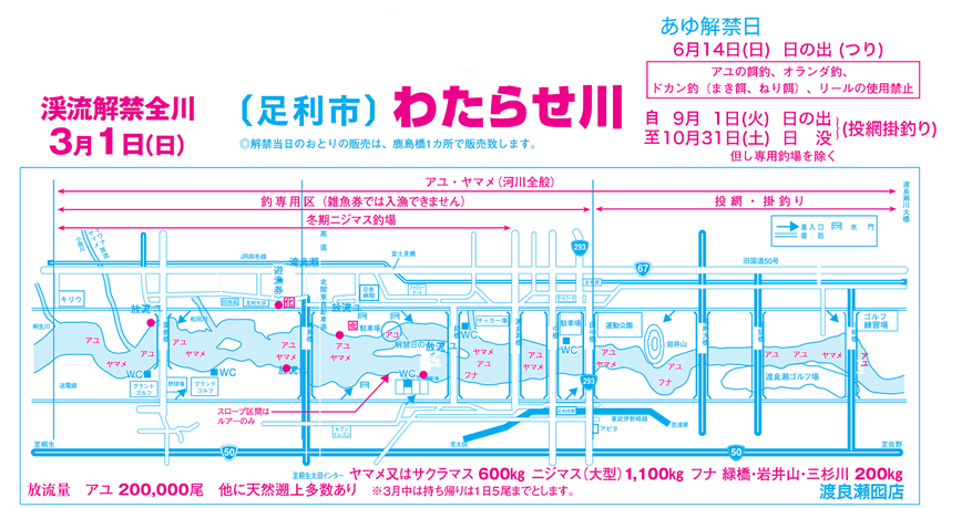 - 渡良瀬川(田中橋から上流)、野上川(木戸橋から上流)、秋山川(牧不動橋から上流)は、雑魚券では入漁できません。